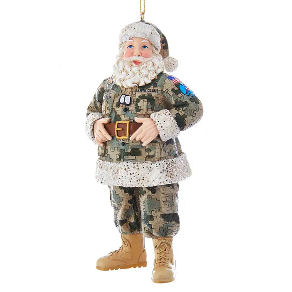 Celebrate the soldier in your family with the Camouflage Military Santa ornament. This ornament features Santa in a camouflage Santa suit and hat including combat boots, patches, dog tags and belt