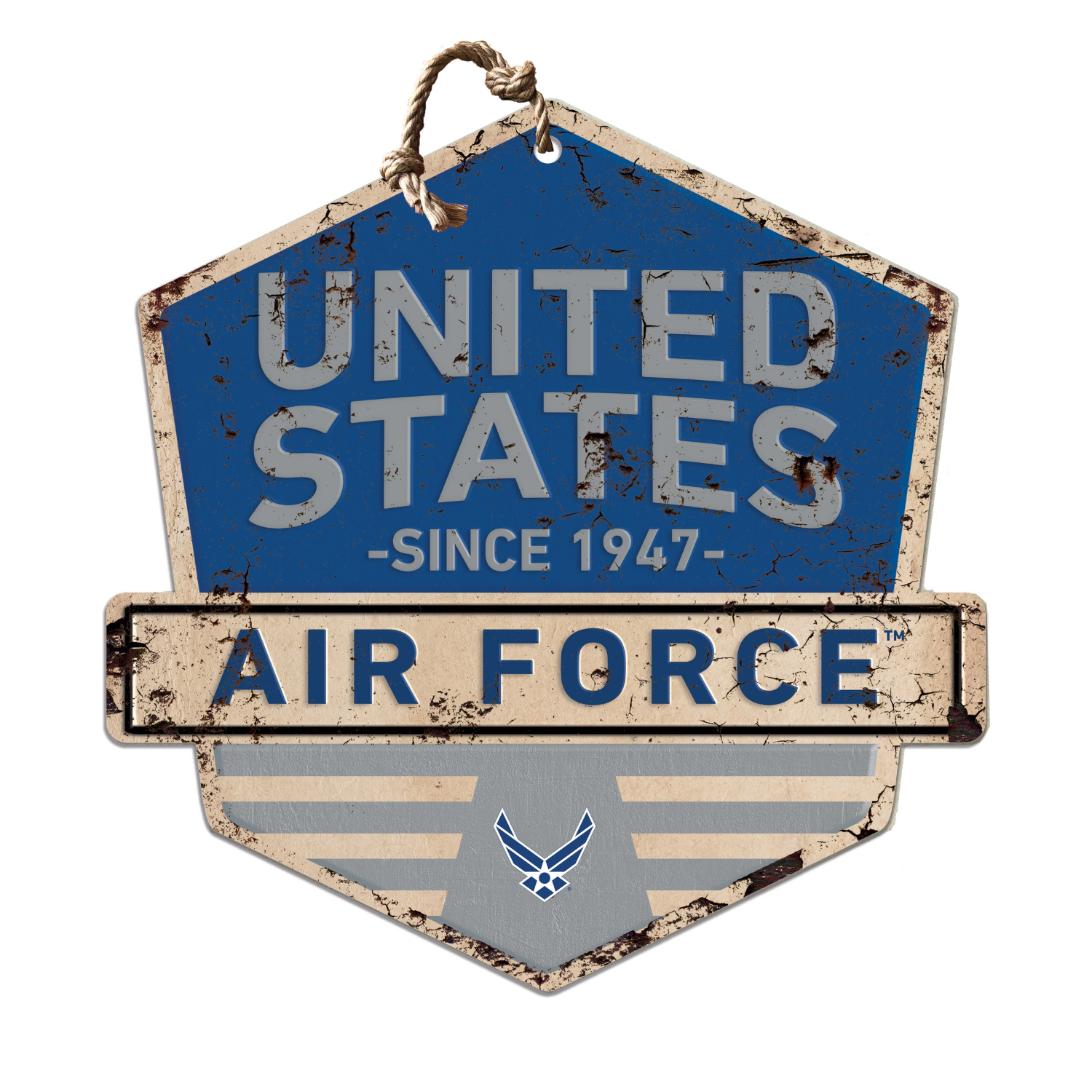 Show off your American spirit by celebrating our Air Force with this unique hanging badge sign. Each piece is digitally printed on MDF, with the look of rusted tin. Add a finishing touch of pride to let everyone see your true spirit in honoring our heroes!