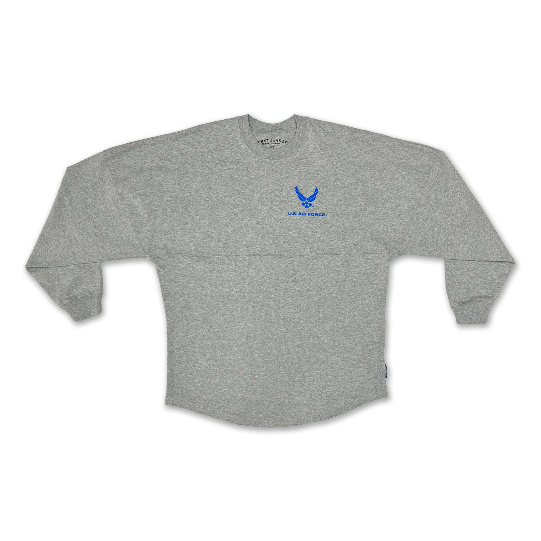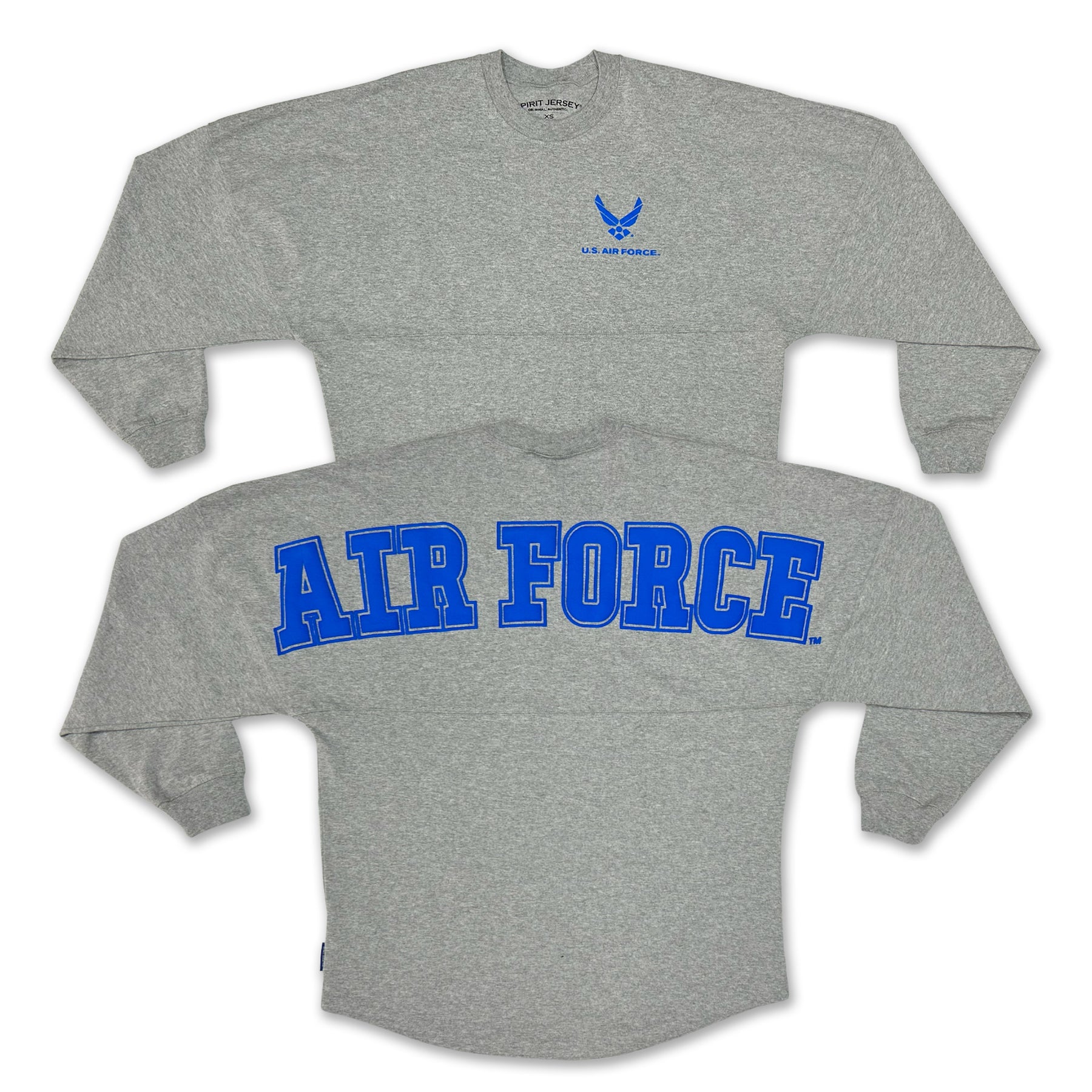 Show off your Air Force pride in style with our Wings Original Crew Neck Spirit Jersey! This comfortable, oversized-fit top features the iconic Air Force wordmark across the back, making it perfect for any proud supporter.