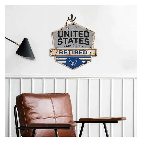 Show off your American spirit by celebrating our Retired Air Force with this unique hanging badge sign. Each piece is digitally printed on MDF, with the look of rusted tin. Add a finishing touch of pride to let everyone see your true spirit in honoring our heroes!