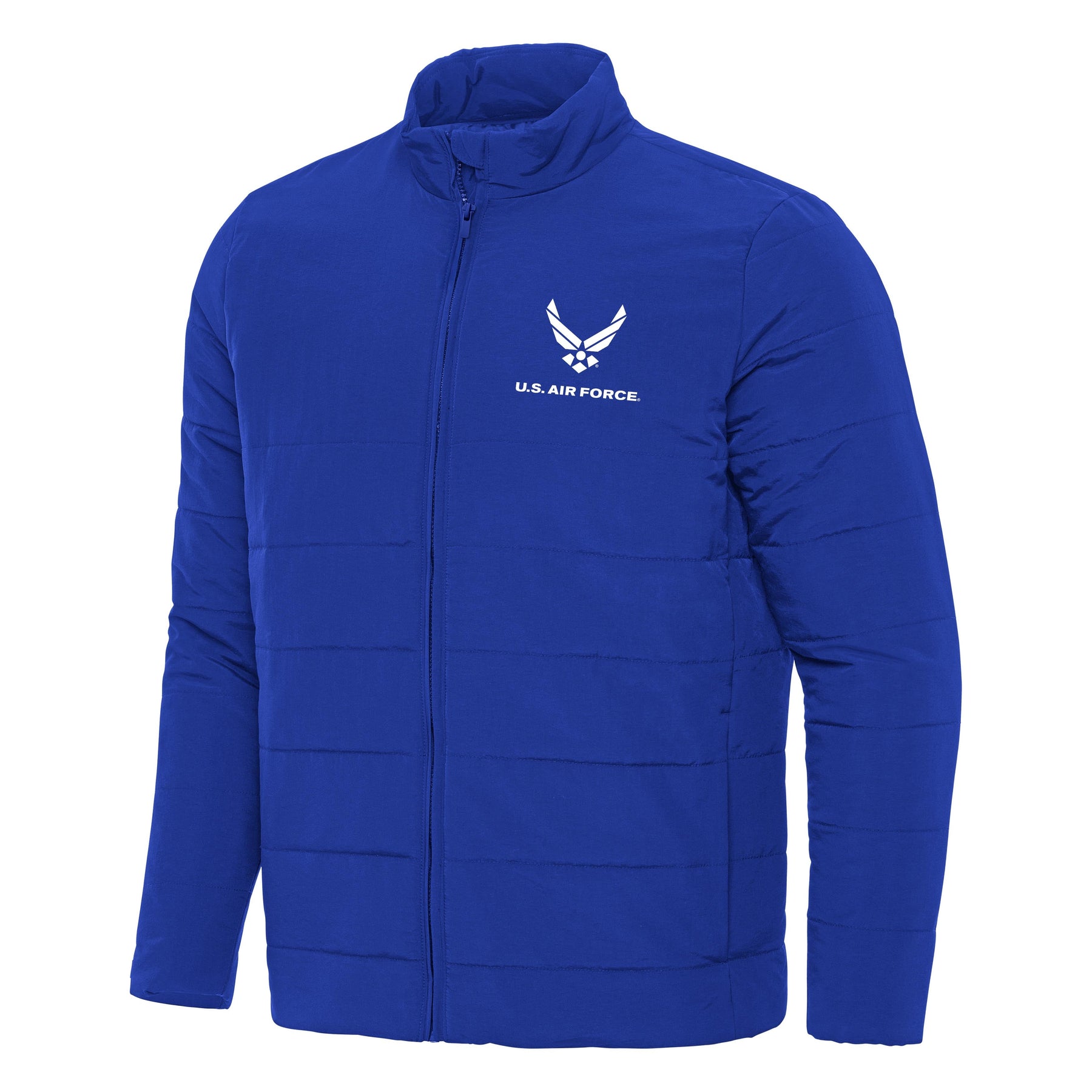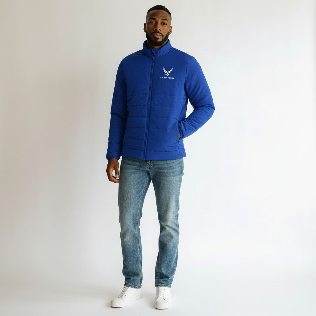 Show your spirit with the Air Force Men’s Swelter Jacket. This quilted “puffer” style jacket is built to keep you warm with a water-resistant shell and cozy insulation. With side pockets, full zip front, and a clean modern silhouette, it’s ideal for layering on chilly days or stepping out in style.