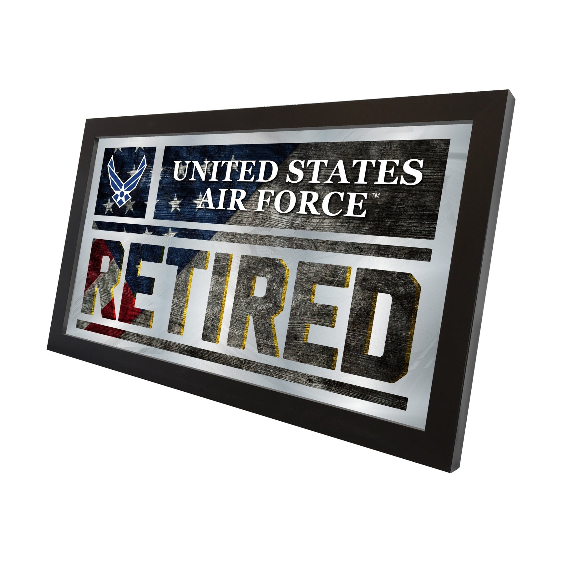 Show your support for our troops with a United States Air Force Retired Wall Mirror! With it's simple but elegant design, colors burst through the 1/8 thick glass and are highlighted by the mirrored accents. Framed with a black, 1 1/4 wrapped wood frame with saw tooth hangers, this mirror is ideal for your office, garage, or any room of the house!