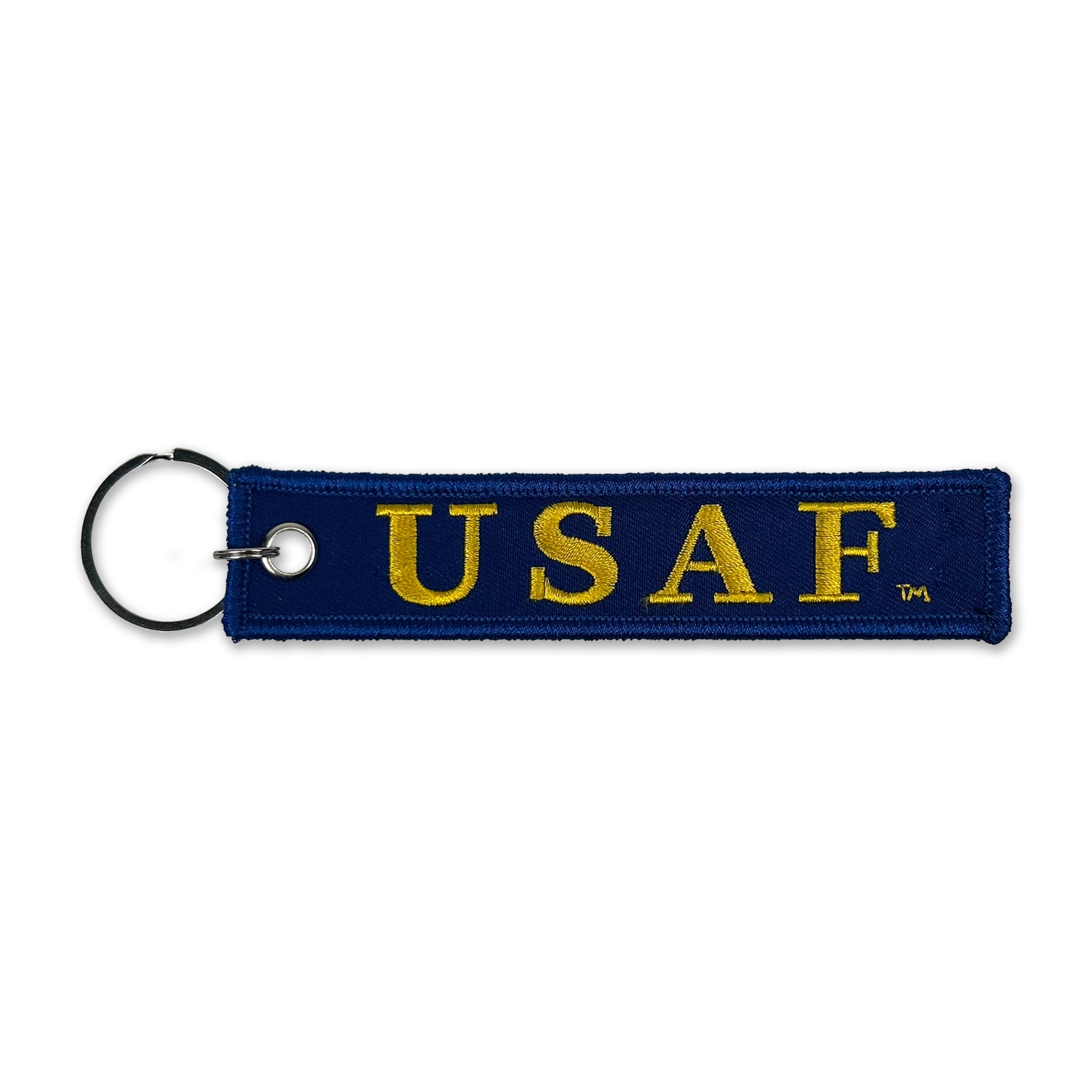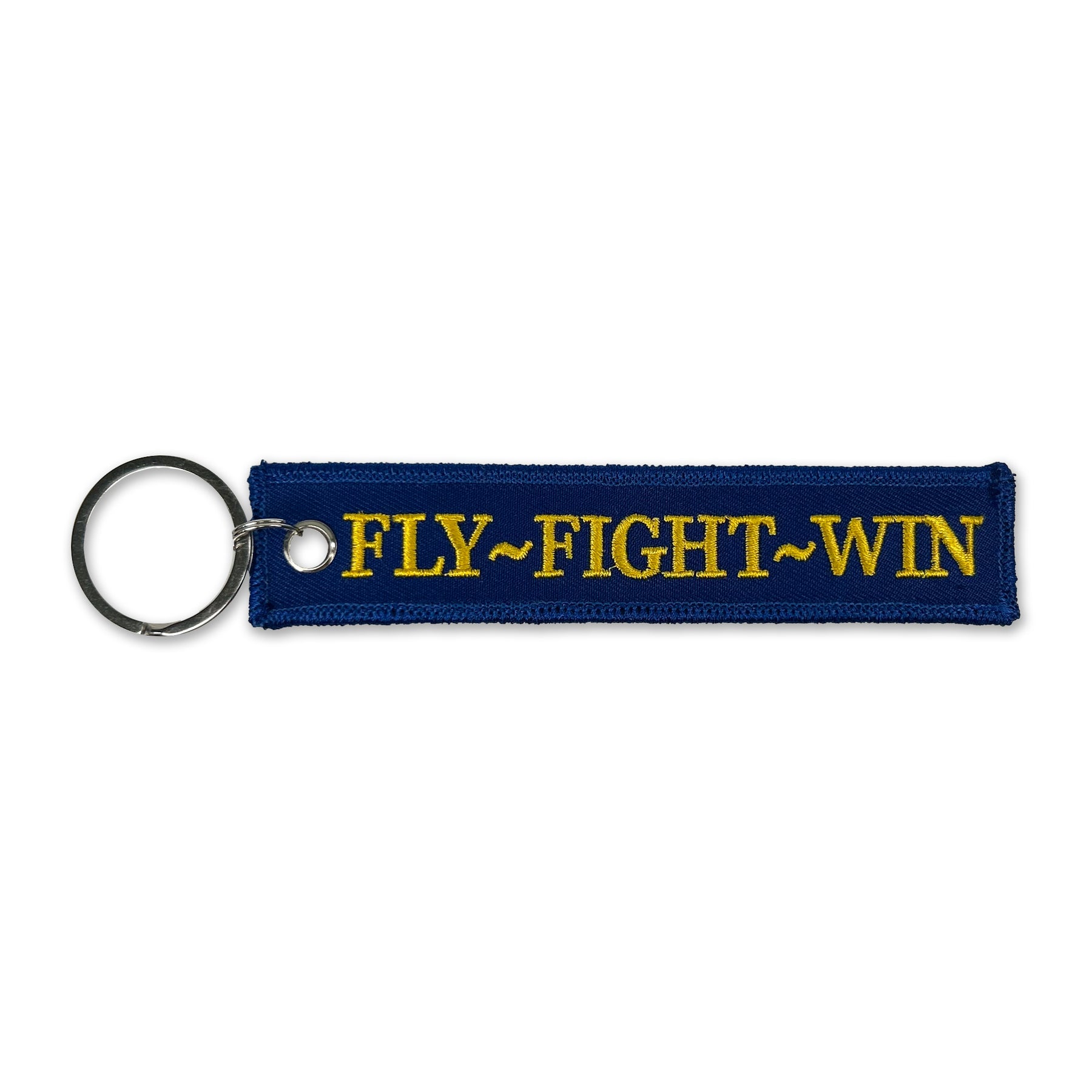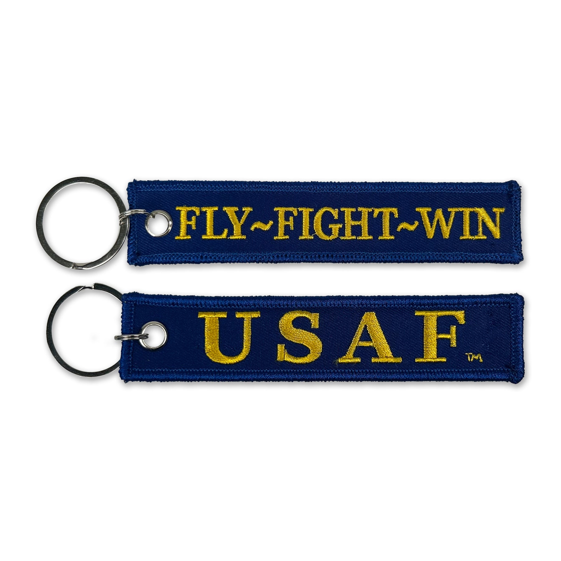 Represent the Air Force with the USAF Fly Fight Win Double-Sided Embroidered Key Chain. Perfect for keys, luggage, or backpacks, this durable accessory features bold embroidery on both sides, proudly showcasing the Air Force's core mission.